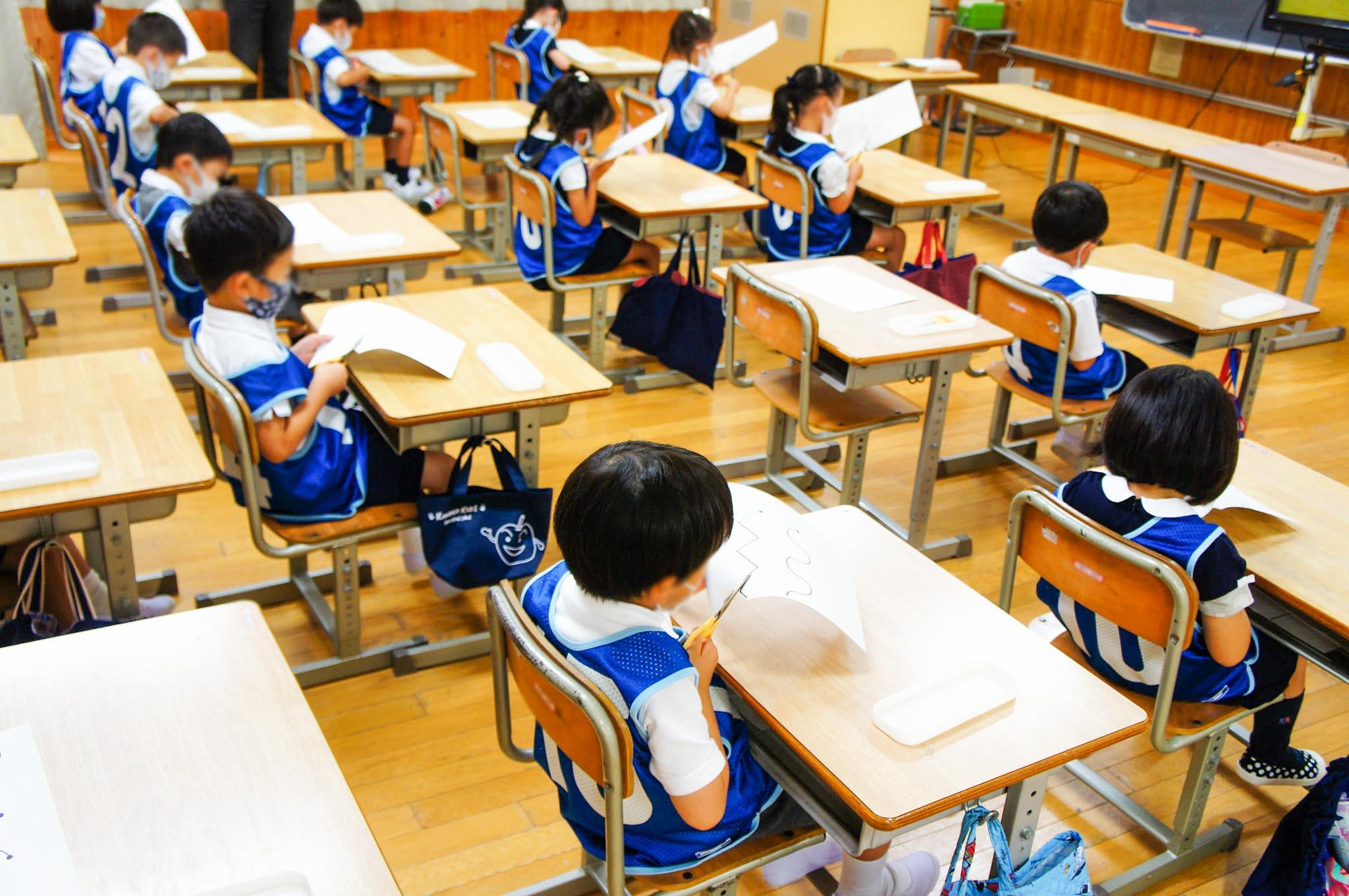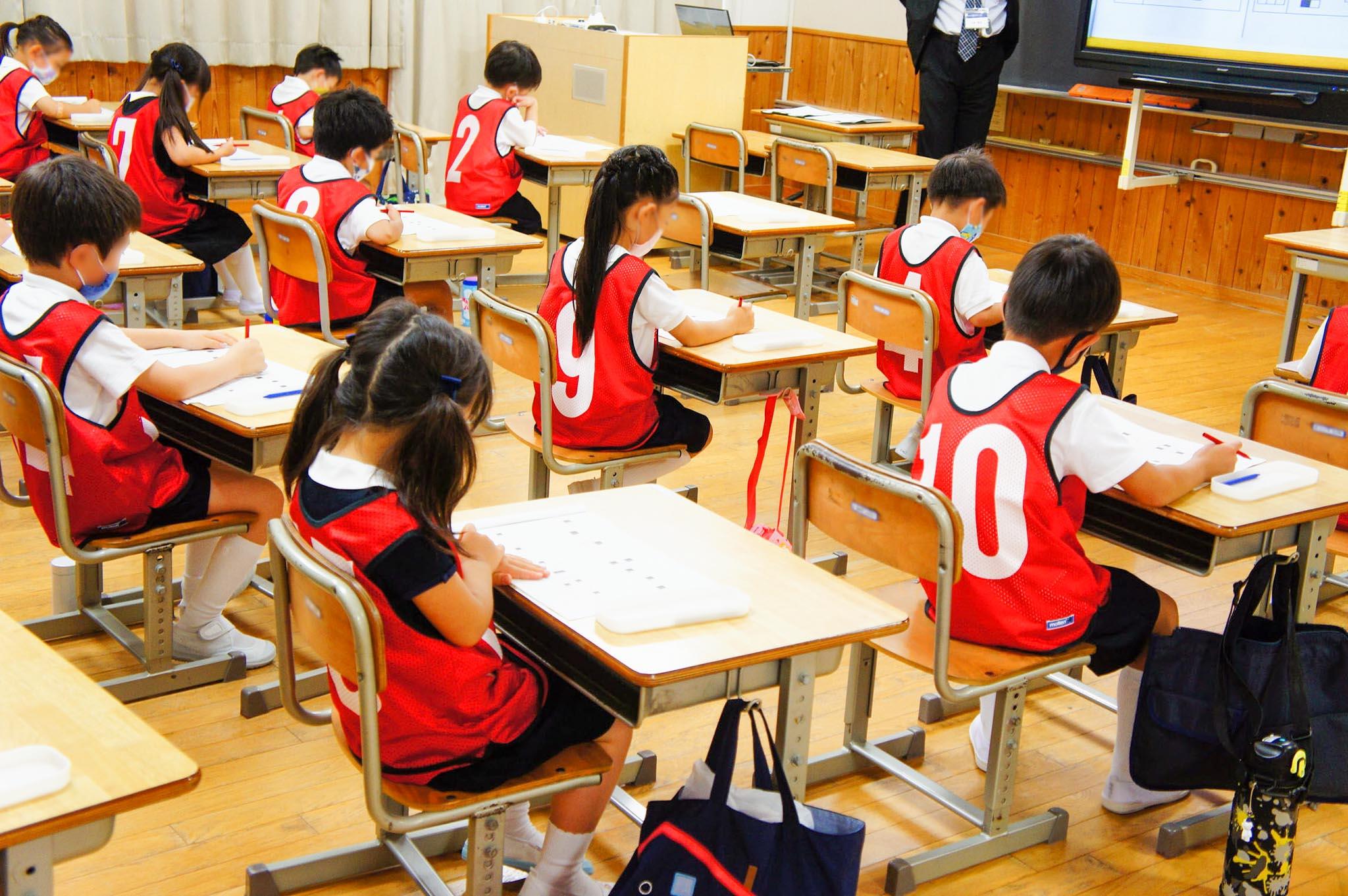 受付を済ませると、子どもたちは2つのグループに分かれて教室に入り、まずはペーパーテストにチャレンジです。