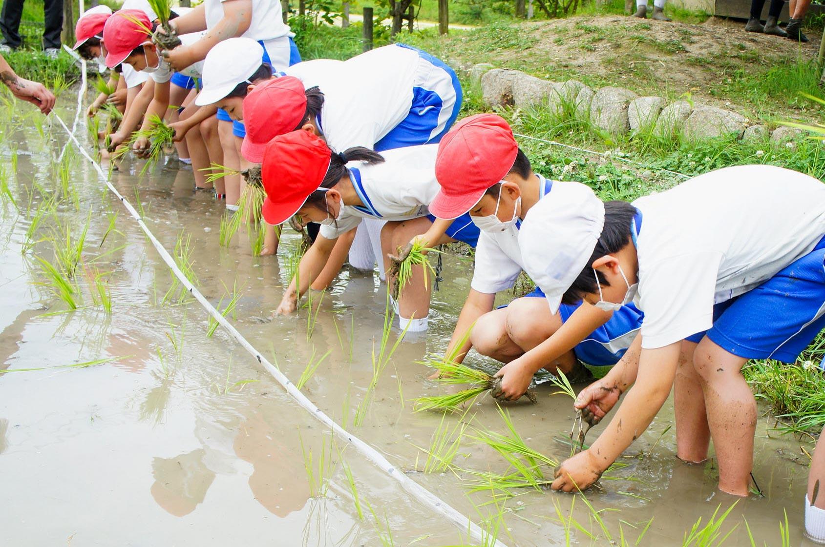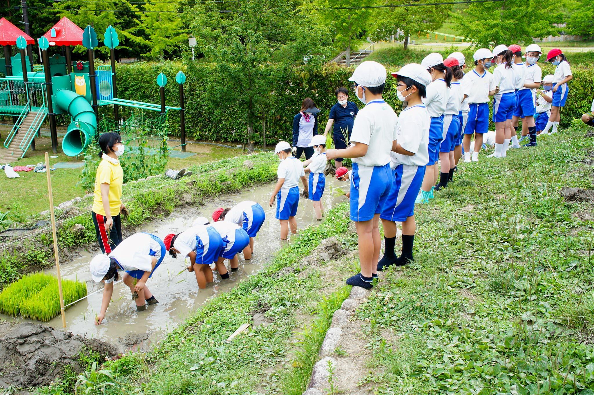 6月18日(金)、P3(小学3年)生、P4(小学4年)生が本校敷地内の棚田で田植えをしました。