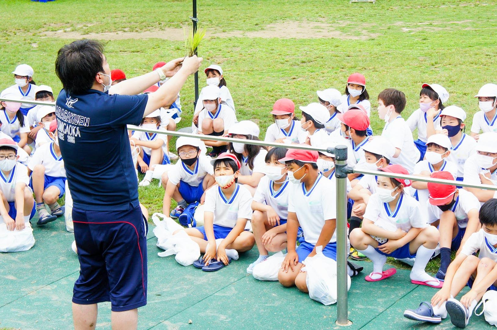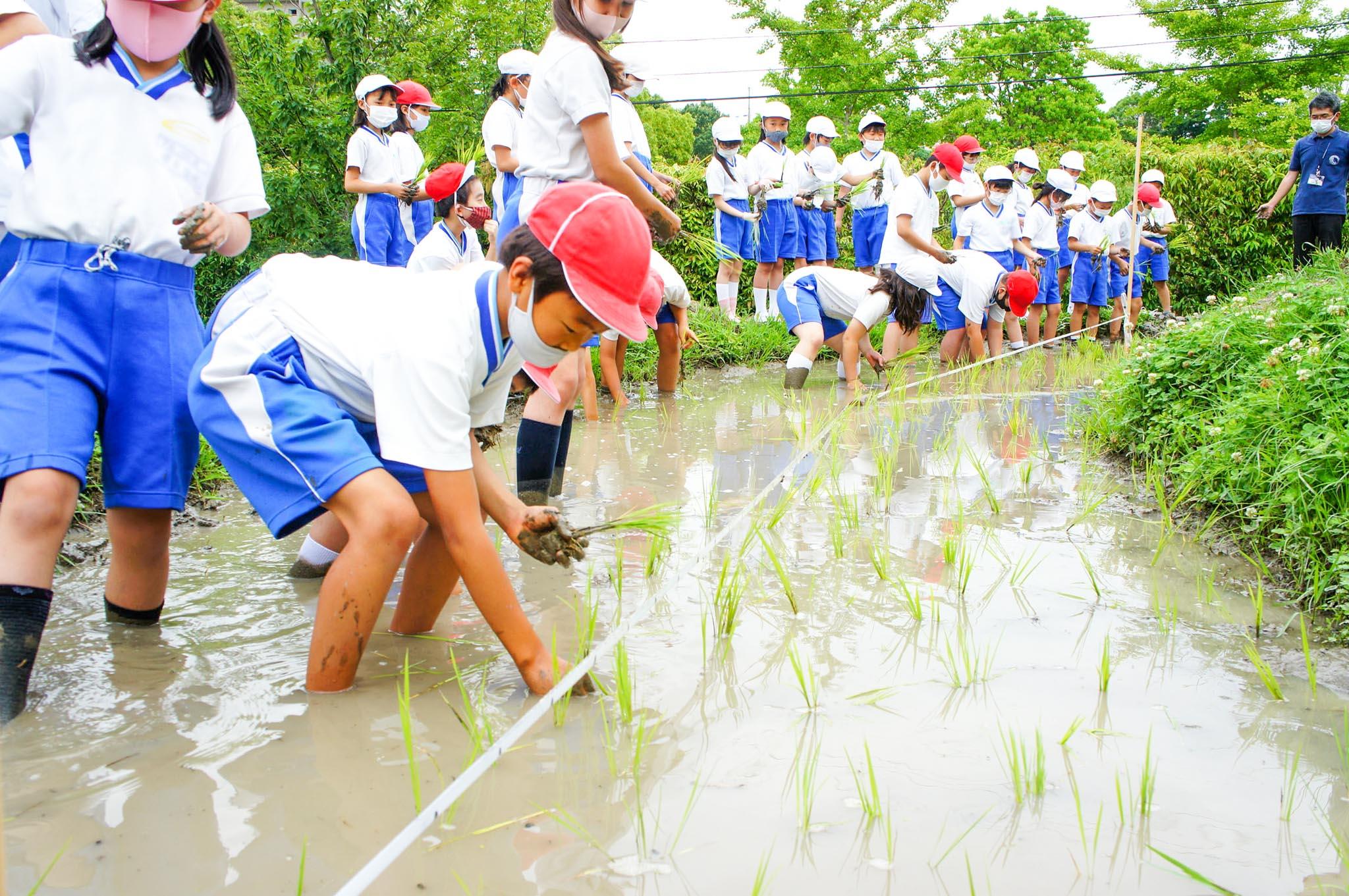 最初は水田に足を入れるのをためらっていた児童たちも、慣れてくると「泥の中、気持ちがいい!」と、体操服や顔などに跳ねる泥も気にせず、根っこがちぎれてしまわないように丁寧に2〜5本ずつ苗を外し、水田の泥の中に植えていきました。自分の苗を植え終わった児童は、斜めになっている苗や浮かんでしまった苗を植え直していました。