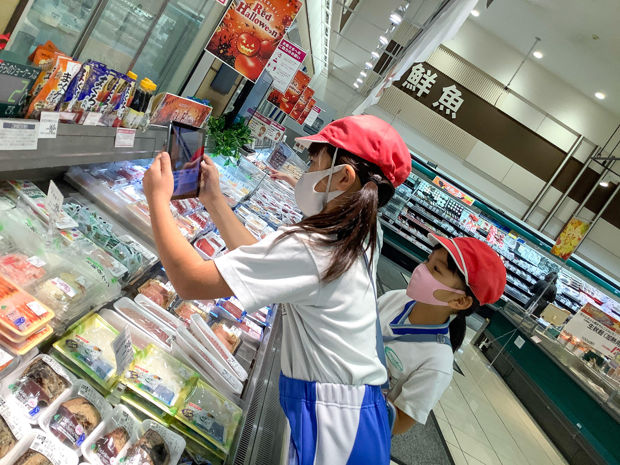 子どもたちは、事前にスーパーのことについて勉強をしています。今日は、お客さんとしての目線・スーパーで勤める人としての目線の両方を意識して、スーパーの工夫を見つけていきました。