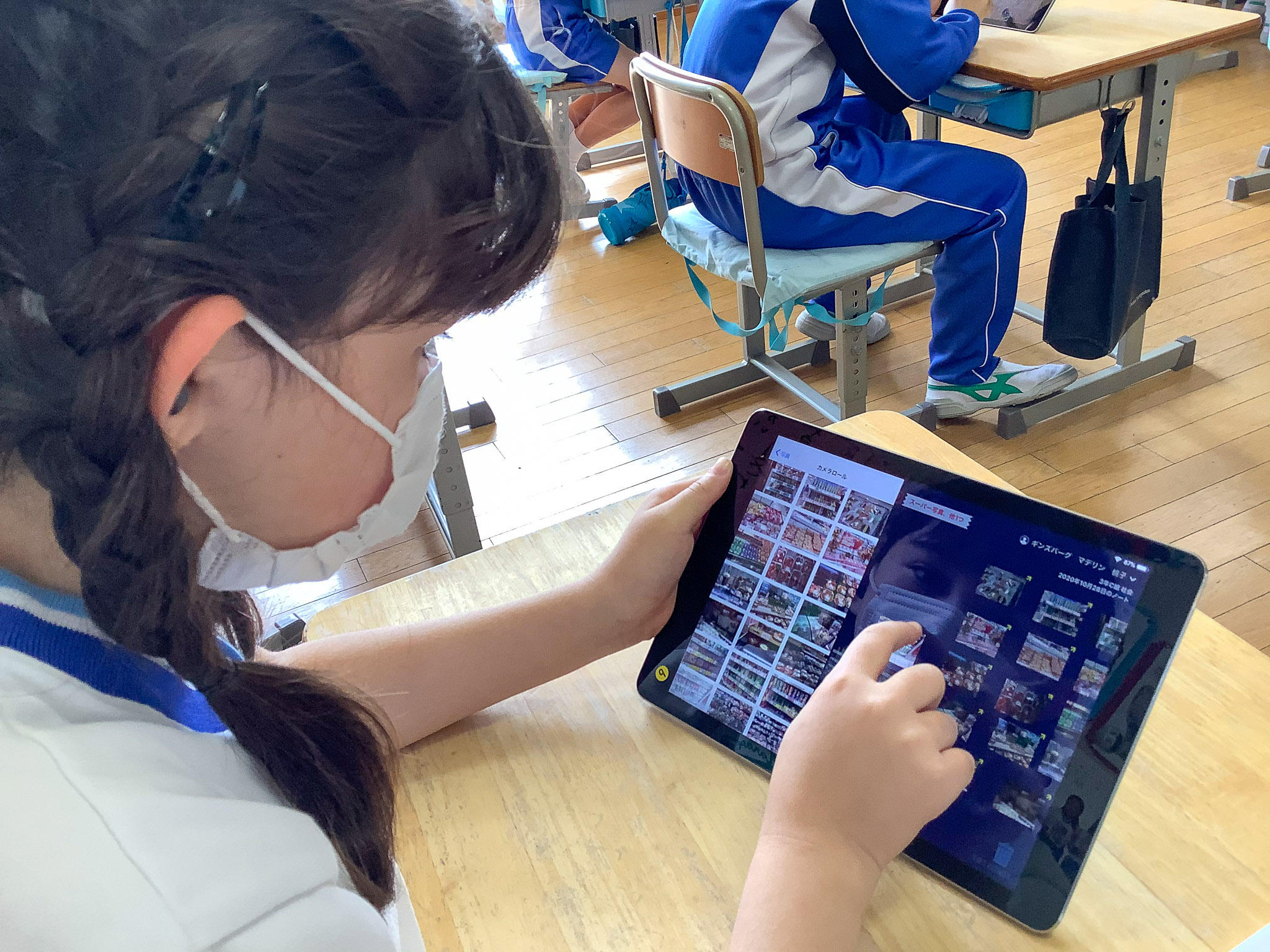 見つけた工夫は、タブレット端末で写真に撮って保存します。学校に帰ってきてからは、撮影した写真から、自分が発表したい工夫を選び、みんなの前で発表する原稿を作りました。