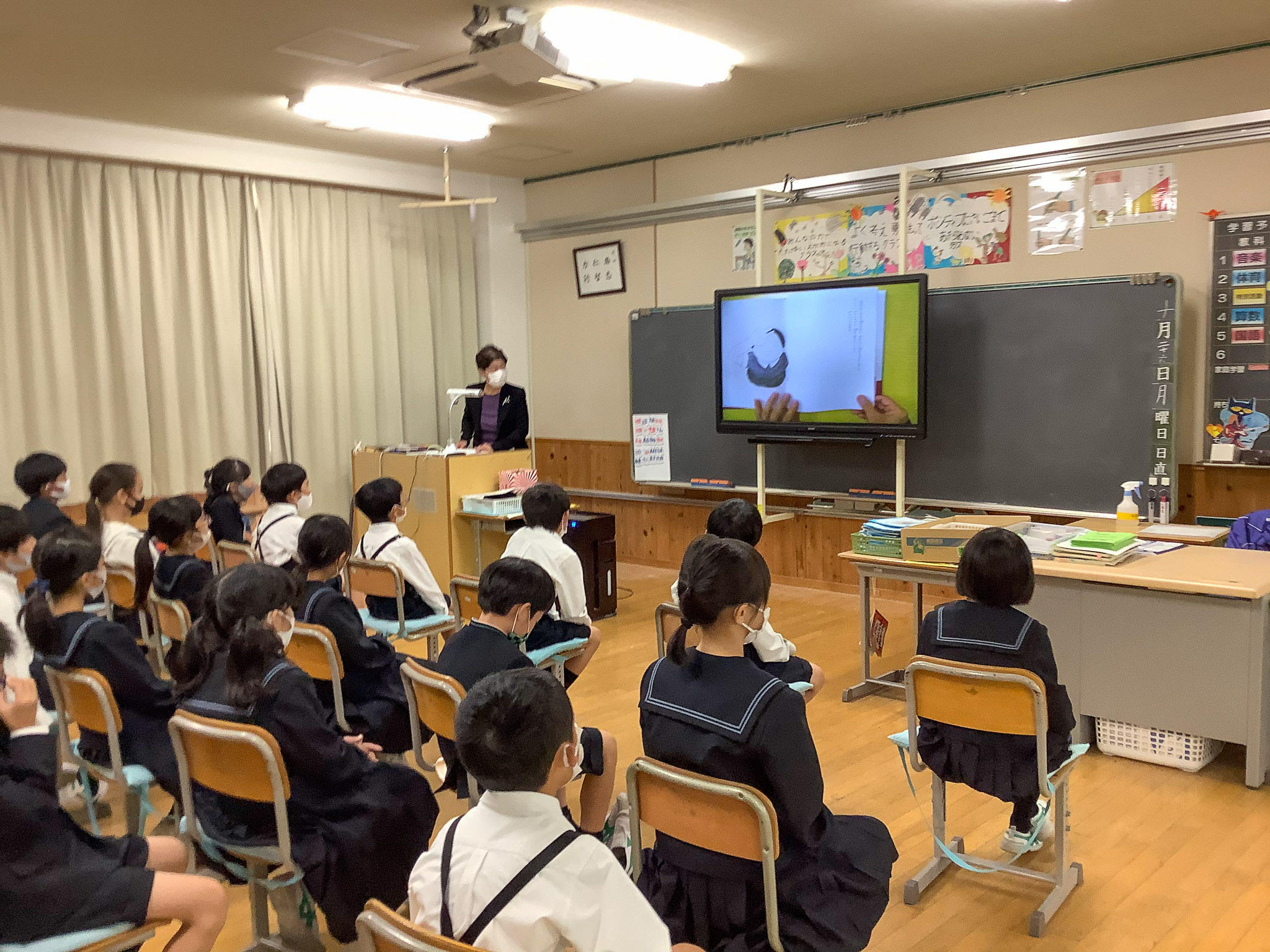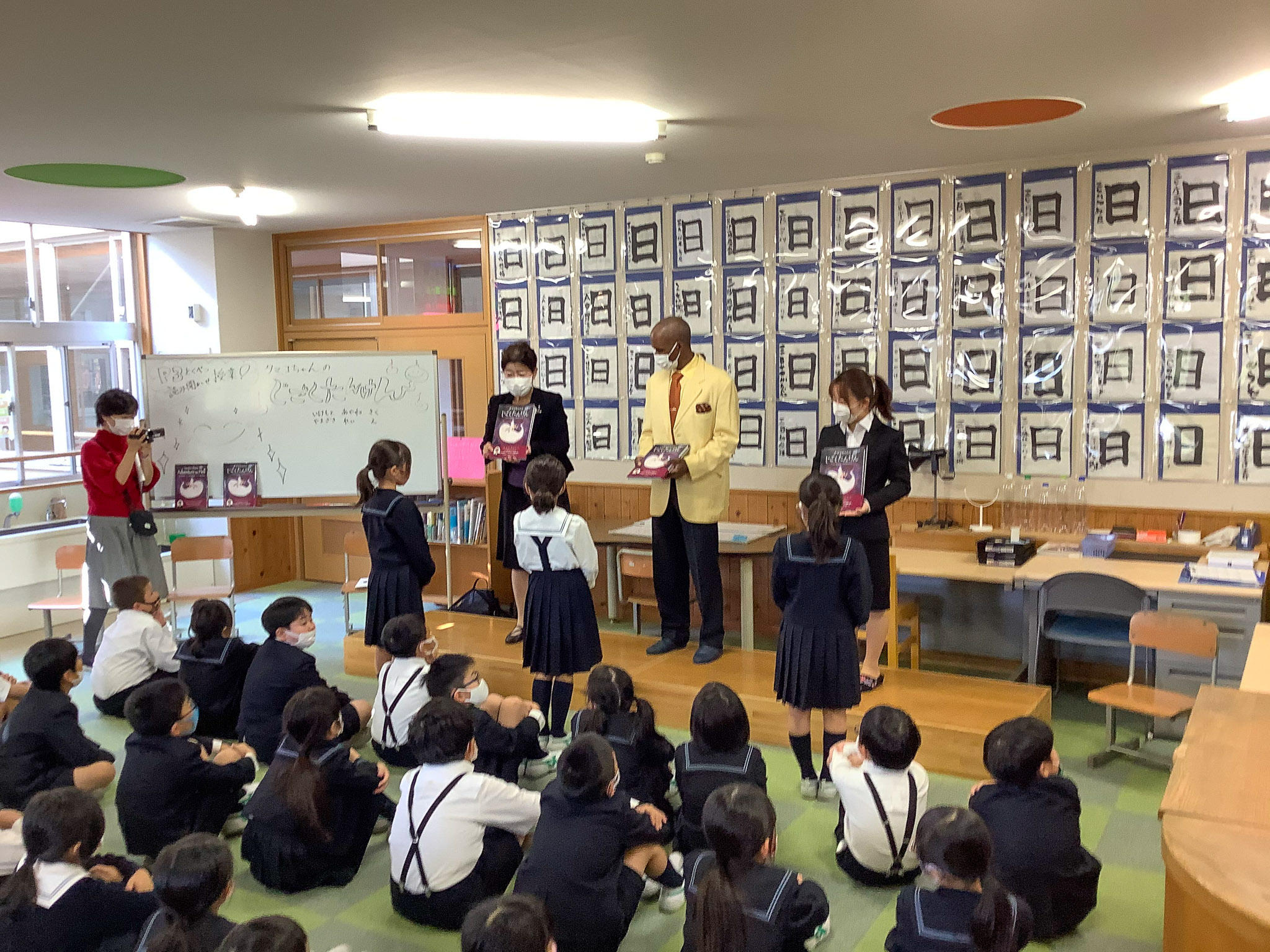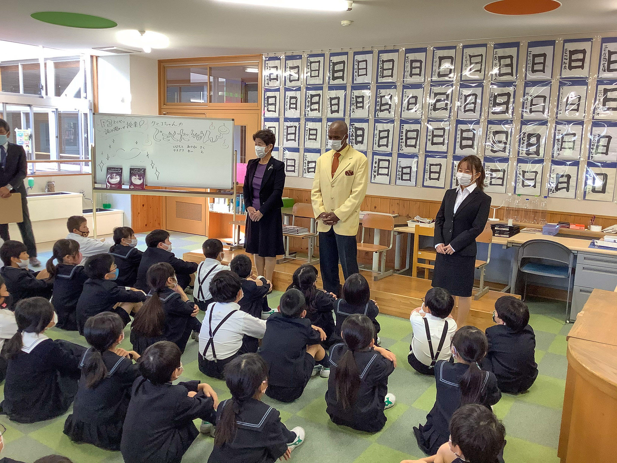 作者であるご本人と、プロデューサーである当時の担任の先生と、英語版の監修をされた方が来てくださり、特別な読み聞かせ授業が行われました。