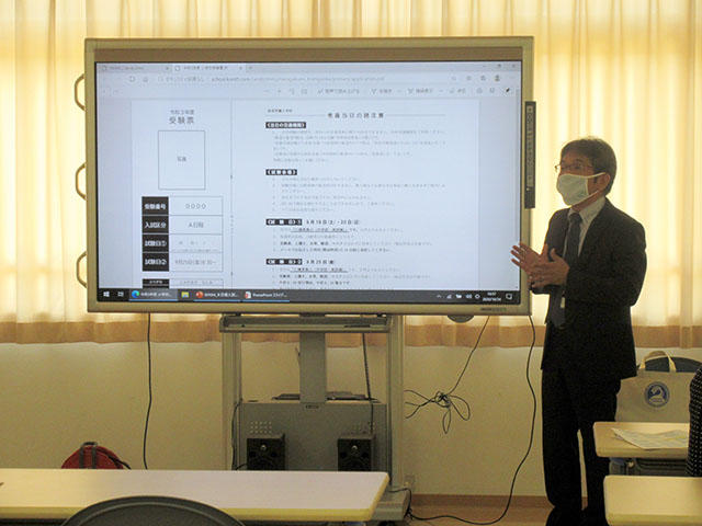 続いて、日比教頭より入学試験の方針と出題傾向について、過去問題を参考に解説しました。また、本年より導入したWEB出願の方法についてスライドと共に説明しました。説明会終了後には、個別相談会を実施。熱心にお話を聞かれる方も多くいらっしゃいました。