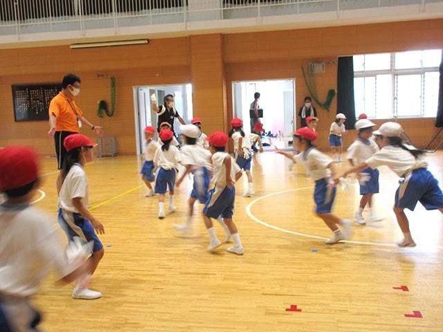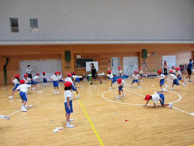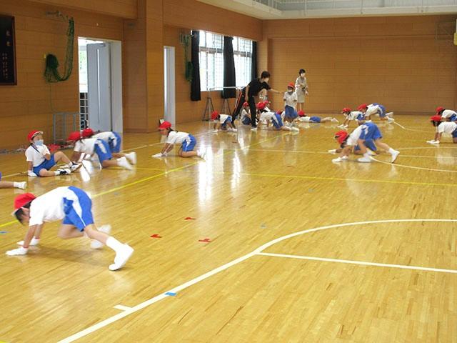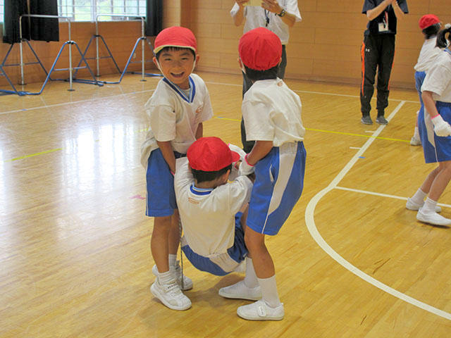子どもたちは、一つずつ配られた軍手を床に置くと、まずは準備運動。上下左右へとジャンプして飛び越えました。身体が温まると、いよいよ軍手を手にはめます。体育館の端から端までを雑巾がけの要領で四つん這いになって走ったり、三人一組となって友達を持ち上げてみたりと、ときに笑い声をあげながらたくさんの汗をかきました。