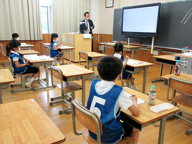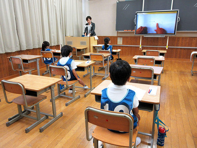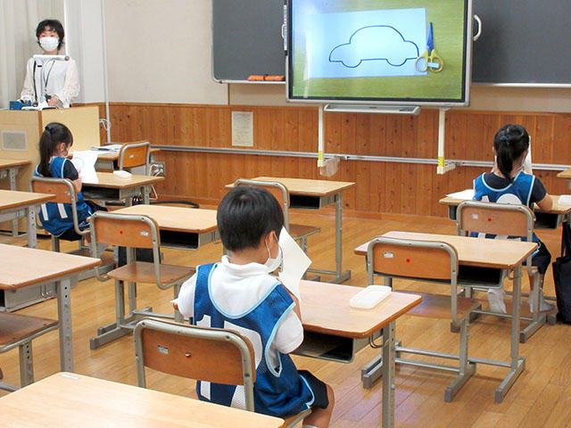 受付を済ませると、子どもたちは1年生の教室に間隔を空けて座り、「ペーパーテスト」にチャレンジしました。先生の話を聞きながら、数や図形、記憶などの問題に取り組みました。続いて、はさみレッスンです。直線からジグザグ、ピザや車の形に沿ってはさみを上手に動かし切っていきました。最後には自由な形を切り抜き、完成した作品は、封筒に入れて持って帰りました。