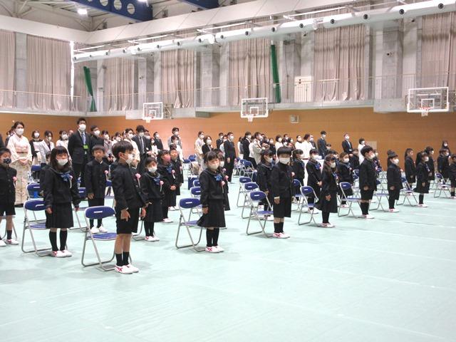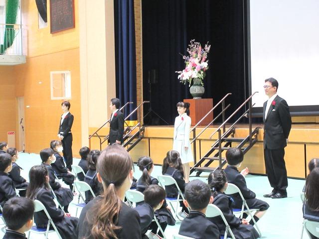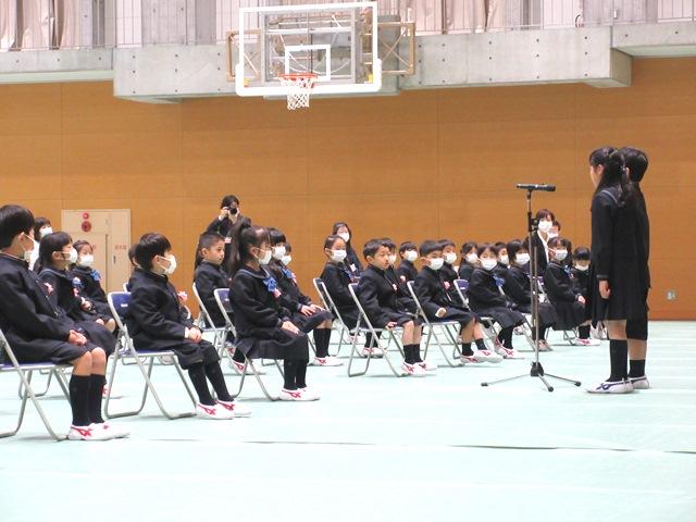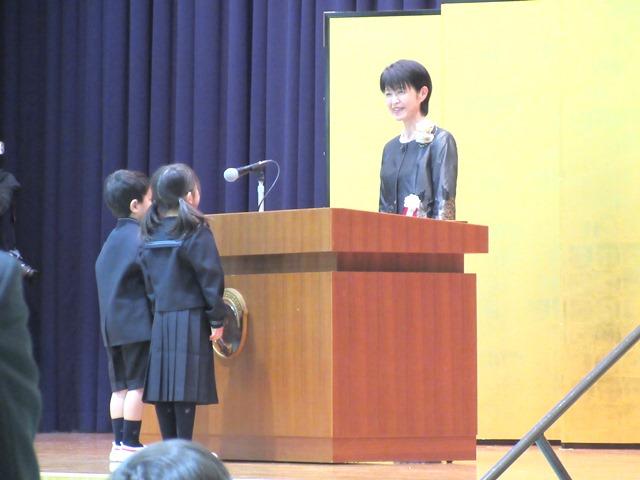 梅田校長は式辞の中で、「新入生のみなさんに3つのお願いがあります。1つ目は、元気に挨拶をすること。挨拶によって”心の窓”を開いてください。2つ目は、『ドラえもん』のように、たくさんの仲間と共に仲良く力を合わせてほしいということ。3つ目は、先生の言うことをよく聞いて、手洗い・うがいをして、ご飯をたくさん食べて、楽しくお勉強をしましょう」と、やさしく語りかけました。