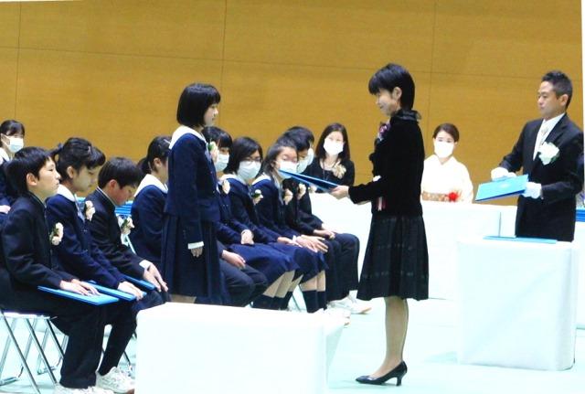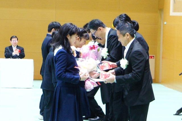まず、梅田校長より卒業生一人ひとりに卒業証書が手渡されました。梅田校長は式辞の中で、メジャーリーグで活躍した松井秀喜選手が大怪我をした後、奇跡の復活を果たした時のエピソードを紹介し「復活を果たした時に語った松井選手の座右の銘『心が変われば行動が変わる。行動が変われば習慣が変わる。習慣が変われば人格が変わる。人格が変われば運命が変わる』を、みなさんもぜひ心の片隅に覚えておいてください。これから人生の中で予期せぬようなことや、辛いことがあっても、常に強い心、目標を高く持ってやり抜く力を身につけてほしいと願っています」と話しました。