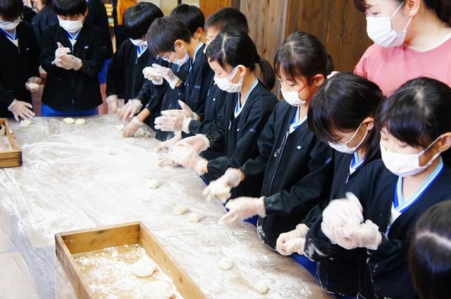 見る見るお餅がつき上がると、大きなテーブルを囲んでの丸餅づくりです。粉だらけになりながら次から次へと丸餅が仕上がっていきました。