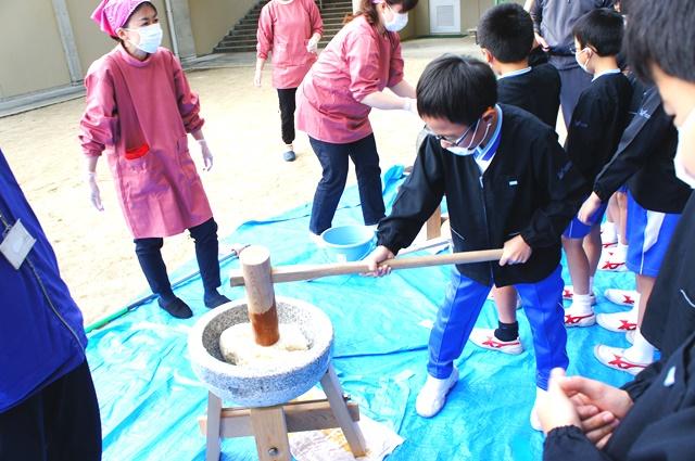 朝早くから保護者の皆様に蒸していただいた餅米を石臼の中へ。3つの班に分かれて、一人10回ずつ力強く杵を振り下ろしました。