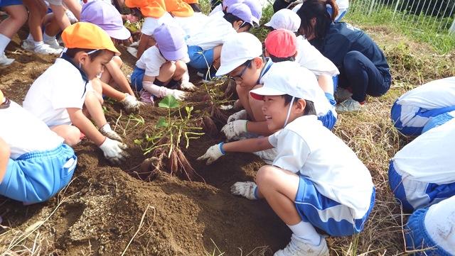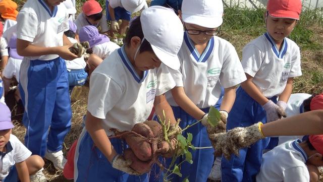 10月15日(火)、P2(小学2年)生がPP2(年中)生と一緒にさつまいも掘りをしました。