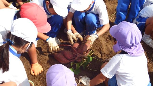 年中児と協力しながら、さつまいもを傷つけないように気をつけて掘り出します。さつまいもの数をかぞえて「今度は10人兄弟だ!」とはしゃいだり、長いさつまいもを折ることなく掘れたときは歓声をあげたりと、立派に実ったさつまいもの収穫を楽しみました。