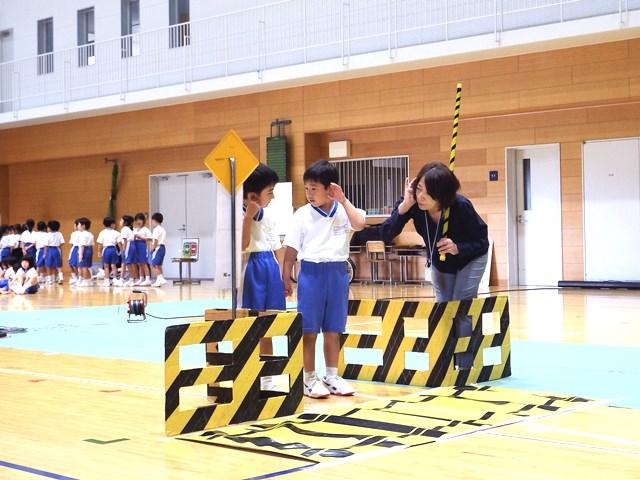 続いて横断歩道の渡り方、正しい歩道の歩き方を習いました。踏切を再現した場所では、目で見て、耳で聞いて安全を確認しながら歩行練習を行いました。お巡りさんのお手本を見て、同じように実践することで理解を深めました。