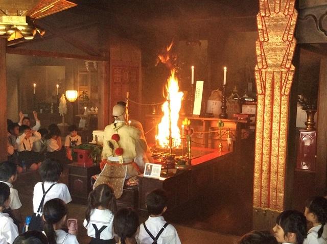 1日目は櫻本坊にて護摩焚きを行いました。子どもたちは学校で事前に、自分の願いを護摩木に書いています。護摩木が、お経と共に焚かれる迫力ある様子に、子どもたちは圧倒されていました。