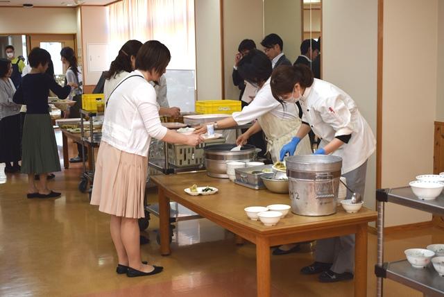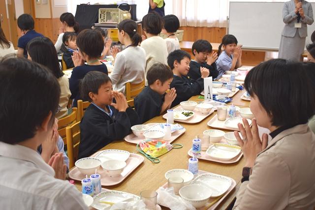 子どもたちが普段食べている給食を、4月に入学したP1生とその保護者の方々が一緒にいただきます。