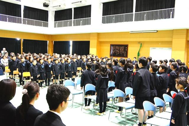 在校生を代表してP3(小学3年)生による言葉と『ぼくらの太陽』の合唱で祝福を受けると、修了生も感謝の言葉と『一歩』の合唱でおかえしをしました。