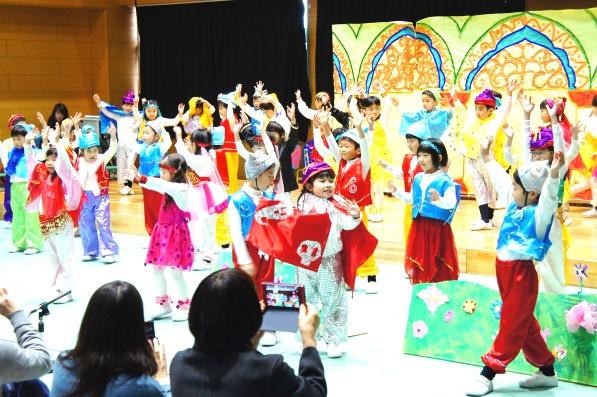PP1(年少組)は、劇「手ぶくろ」です。ネズミやカエル、ネコ、キツネなど、さまざまな動物に扮した子どもたちが次から次に出てきて、愛らしく演じました。PP2(年中組)は、劇「ブレーメンの音楽隊」です。ロバやイヌなどに扮した子どもたちが、舞台を前へ後ろへと動き回り、全員でダンスを披露し、観客席から大きな拍手が送られました。PP3(年長組)は、劇「アラジンと魔法のランプ」です。年長児たちが物語の進行や台詞を考えて作り上げていて、舞台をいっぱいに使ってカラフル衣装に身をつつみ、華麗なダンスを披露しました。