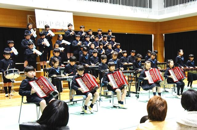 P1(小1)生は群読「おむすびころりん」の発表です。それぞれの台詞をしっかりと演じ、言葉の抑揚も絶妙でした。P2(小2)生の発表は、音楽発表「とみっこ音楽隊」です。全員で演奏する鍵盤ハーモニカでの『ディパディドゥーダー』の迫力や、ダンスも入れた『ヤングマン』の演奏で、会場全体を楽しい雰囲気に包んでいました。P3(小3)生は群読「ぼくたちの春夏秋冬」の発表です。1年間を通した学校での思い出や生活の中の様子を、季節ごとに群読しました。春には花が咲き、夏はセミが鳴き、秋はお祭を楽しみ、冬は雪が舞う様子を、さまざまな小道具を手にしながら、情緒たっぷりに表現しました。P4(小4)生の演目は音楽発表「友だちだから」です。全員のリコーダー演奏から始まり、さまざまな楽器も参加して、『ジュラシックパーク』のテーマ曲を見事に演奏しました。