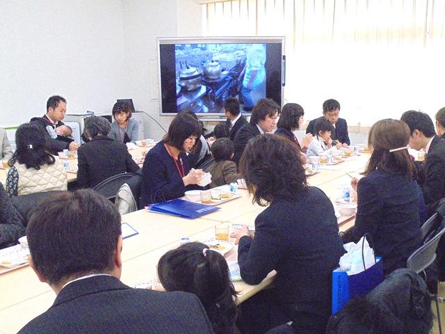 授業見学の後は給食試食会です。給食の献立は、わかめごはん、白身魚の磯辺揚げ、和え物、味噌汁、ジョアです。食材や味付けのこだわりについて栄養士の方から説明がありました。全員で「いただきます」をして食事を開始。家族で談笑しながら、とても楽しい一時を過ごしていただきました。