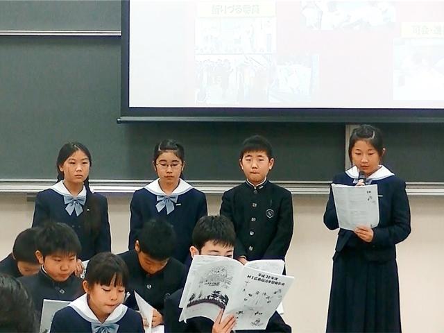 12月8日(土)にM1広島宿泊学習報告会を行いました。今回は教員が話すのではなく、子どもたちが3日間の振り返りの中から自分が一番心に残ったことを選び、一人ずつ報告するという形をとりました。一人ひとりが自分の言葉で広島での学びや、自分の成長を一生懸命発表することができました。宿泊学習を運営する特命委員会(学級代表、企画委員、司会・進行、しおり、おりづる、レクリエーション)も自分たちの活動を振り返り、成果と課題を代表者が発表しました。この会の司会進行も係の子どもたちが務めました。