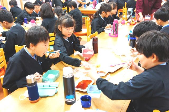 つきあがったお餅を小さくちぎって丸め、実食です。テーブルの上には家庭科の時間にビート(砂糖大根)から作った砂糖、醤油と砂糖醤油、きな粉が並べられ、できたてのお餅をいただきました。