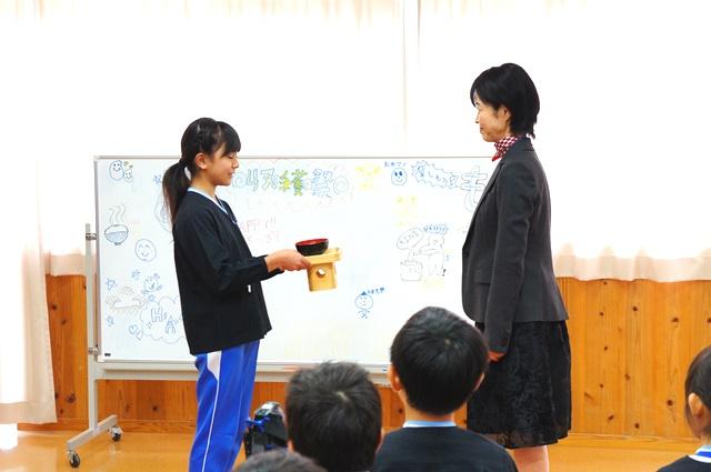 まずは、収穫祭を行いました。先日の稲刈りで約10㎏のお米を収穫しました。それまでにはたくさんの方々が協力をしてくださったことに心からの感謝を込めて、子どもたちの代表から梅田校長に収穫したお米を納めました。