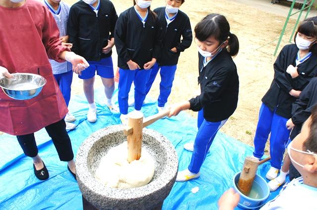 ふっくらと蒸しあがったもち米を3班に分かれて餅つきをします。みんなの「よいしょ!よいしょ!」の掛け声と共に、ペッタン!ペッタン!と力強く振り下ろし、もち米がみるみるお餅に変わってきました。
