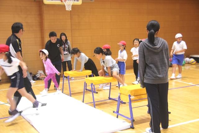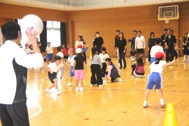 はじめにダンスミュージックに合わせてみんなでラジオ体操を行います。スピードアップしていく体操に、子どもたちは必死に体を動かしていました。その後は保護者の方々と子どもたちに分かれて、柔らかなボールでドッジボールを行いました。三角コーンを使ったけんけん飛びや鉄棒、マット、跳び箱など、さまざまな道具を使ったサーキット「運動あそびツアー」で体を動かしました。
