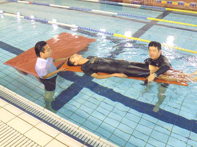 後半はプールでの事故を想定した処置です。水に浮く担架の組み立て方や、水の中から人をスムーズに引き上げる方法を学びました。