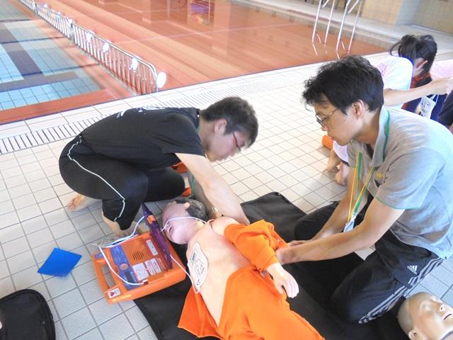 水の事故から命を守るために、現場で行うべきことやその順番について説明を受けました。次に、グループごとに訓練用人形を使っての心肺蘇生法を体験しました。胸骨圧迫と人工呼吸、AED(自動体外式除細動器)の使い方、手の動かし方や器機の扱い方だけではなく、意識を確認するための声かけなども試みました。