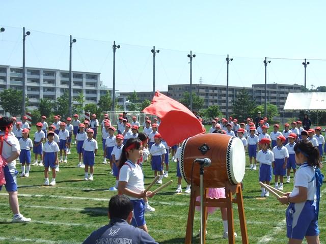 開会式で梅田校長は「今年は10周年という記念の回です。それにふさわしい、たくましい心と身体を育てるスポーツフェスタであってほしいと思います」と激励しました。児童代表のP4生が選手宣誓をし、赤組と白組、それぞれの応援合戦が繰り広げられて、競技は始まりました。