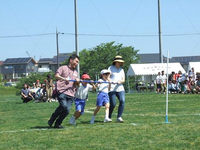 プログラムは、徒競走やリレーをはじめ、全学年が参加した「みんなでころころ大玉めいろ」やP1とP2による「音楽玉入れ」などが行われ、観客の大きな声援もあって大いに盛り上がりました。また、P3の「台風の目」やP4の「2人3脚リレー」など、各学年の親子競技では、親子で協力し、白熱した戦いになりました。