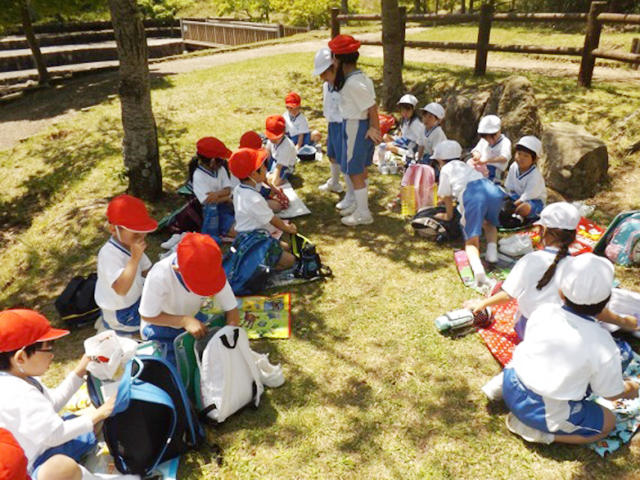 さぁ、いよいよ一番楽しみにしていたお弁当とおやつの時間です。各クラス大きい輪になって、楽しく、そしておいしくいただきました。
