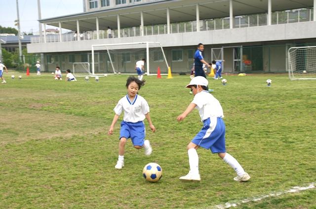 PP3(年長児)~M2(小学6年)生までの希望する園児と児童が、毎週月曜日の放課後に行っている奈良登美サッカースクール。15時30分からの幼稚園のクラスに続いて、16時50分からは小学生を対象としたクラスです。本校教員に加えセレッソ大阪のコーチ2名の指導の下、まずは、ウォーミングアップからスタート。続いて守備と攻撃の練習や、ドリブルや1対1でボールのやり取りの練習に取り組みました。