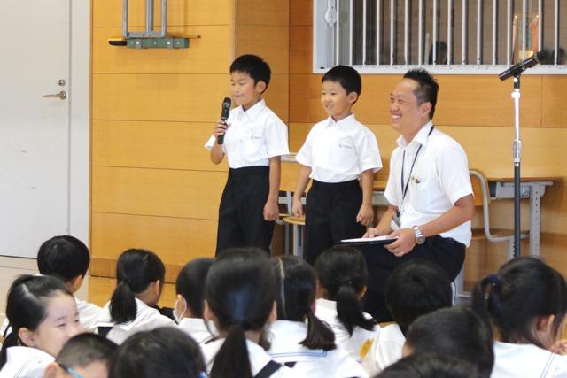 次に、2学期から編入する新しい2名のお友だちの紹介がありました。自己紹介の中で「僕は野球が好きです」の言葉に、児童の中から「よっしゃ〜!」の声が聴こえました。さっそく新しい学校生活での仲間ができたようです。