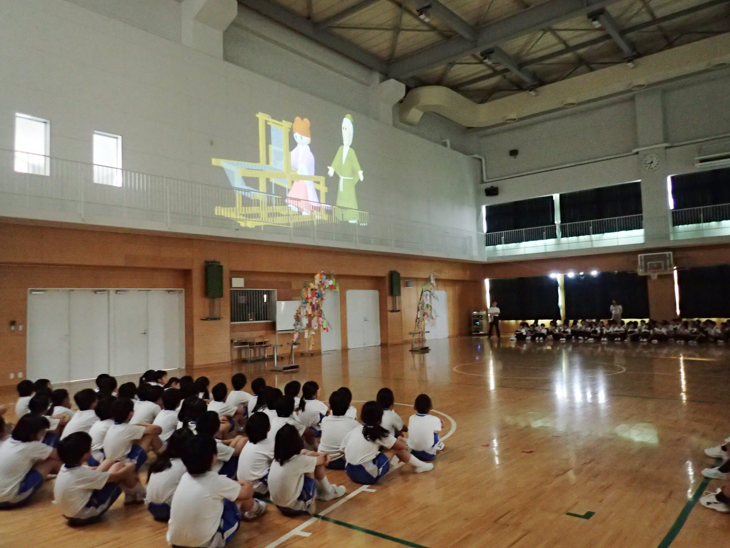 いつもとは違う、薄暗い体育館に入ると、大きく七夕物語のスライドが映し出されました。語り手はP4生です。P4生の落ち着いた七夕物語の語り、にPrimaryの子どもたちは耳を傾けながら、七夕の世界へ引き込まれていきました。