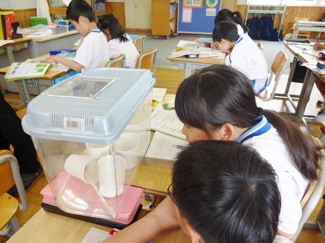 5月17日朝、子どもたちが育てているモンシロチョウのさなぎがいつもと違う様子に気づきました。