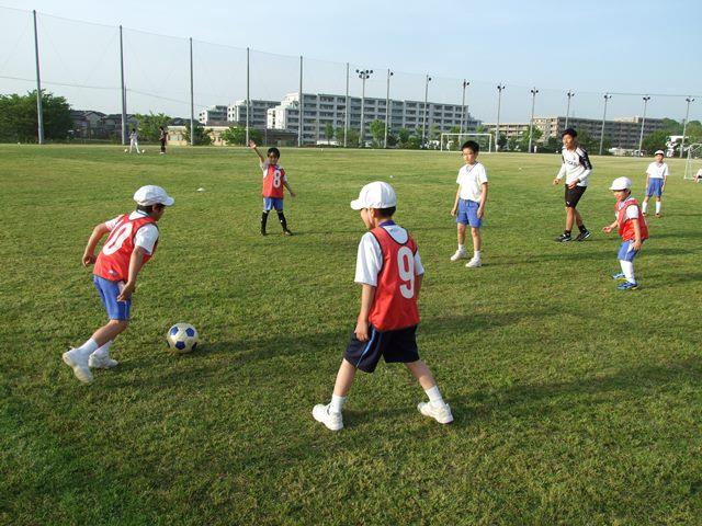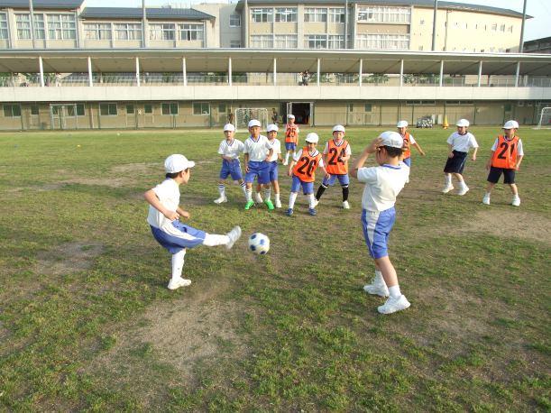 続いて、試合が行われました。チーム分けや対戦相手の選び方、どのコートを選ぶかなど、自分たちで考えてプレーを開始。コーチや先生はルールの説明をしたり、ボールの蹴り方などのアドバイスをしたりしながら、終始「どうしたら、少しでも早く試合を始められて、長く楽しめるのか考えよう」と、子どもたちが自分で考えるような声かけをしていました。