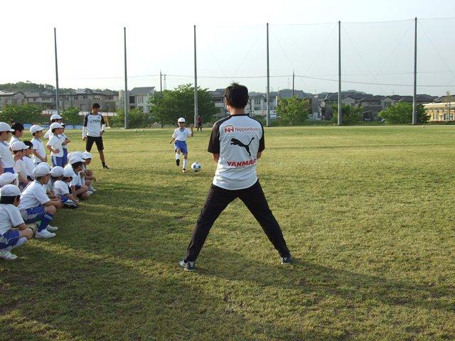 まずは、ウォーミングアップからスタート。コーチの指導で、グラウンドに置かれた目印を10回まわれば10点がもらえます。どの目印をどのように回るか、それぞれが考えながら挑戦しました。上手くできた子も、できなかった子も、それぞれで考えながら身体を動かすことの喜びを学びました。