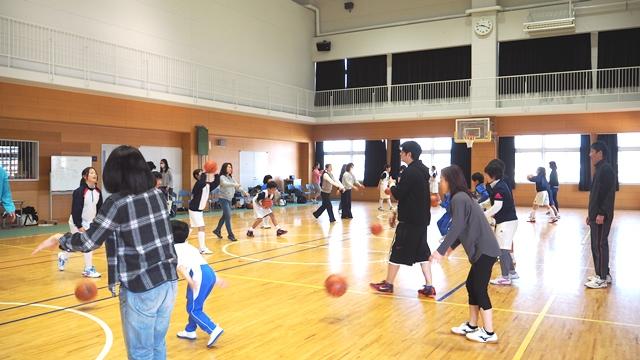 まず、いつもバスケット部が行っている練習メニューを親子でしてもらいました。パスは親子で向き合って行い、ドリブルはリレーなどをしました。どれも楽しく和やかな雰囲気でお互いに声かけをしている様子も見られました。