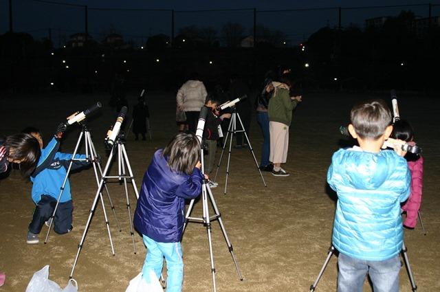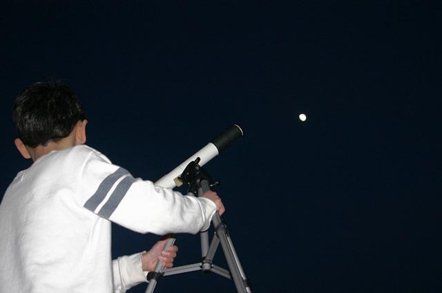 外も暗くなってきたところで、第1回目に、自分たちで組み立てた天体望遠鏡を持って校庭に出ました。明るく輝く金星、少し欠けた月のクレーターもくっきりと見ることが出来ました。