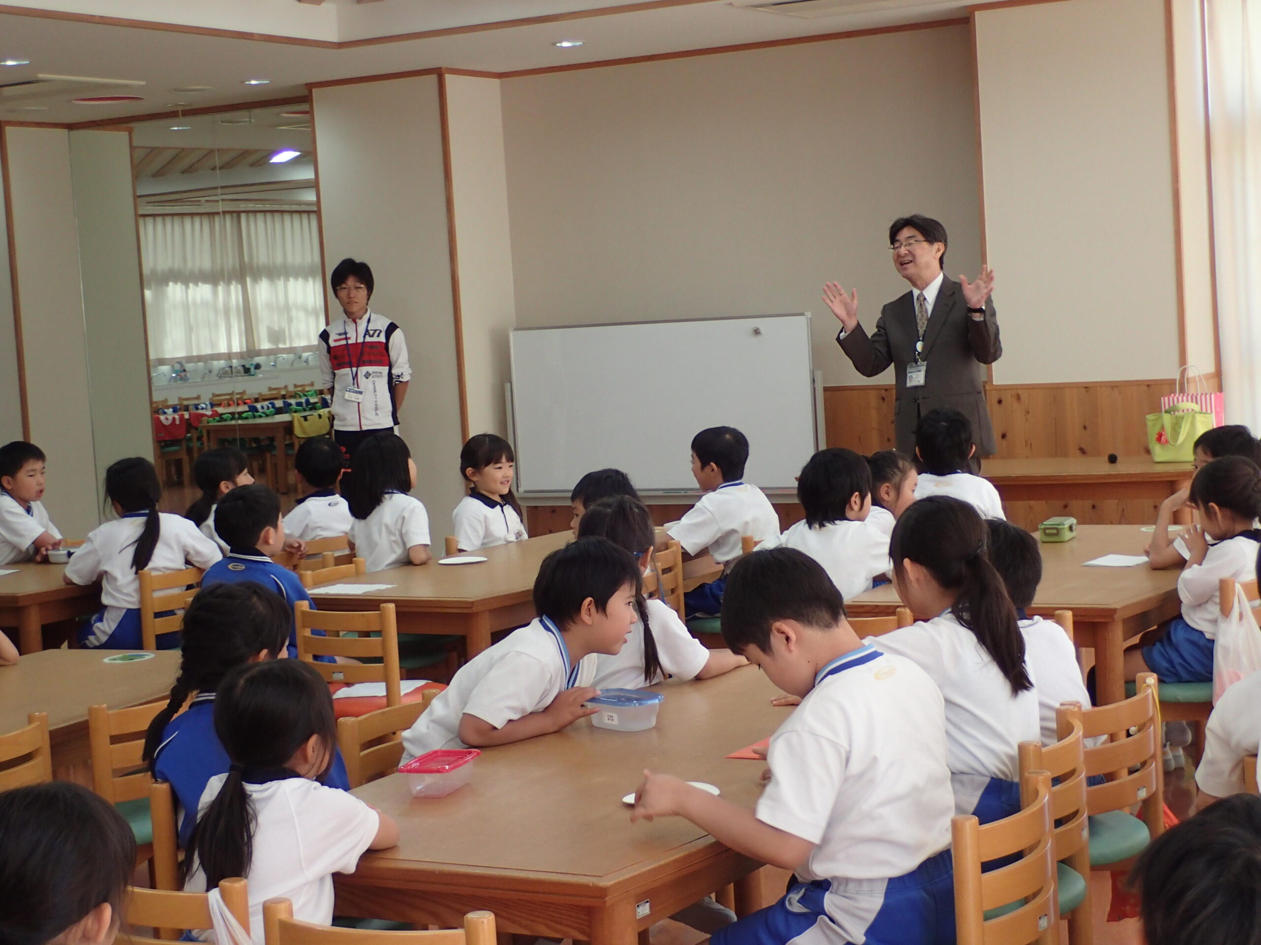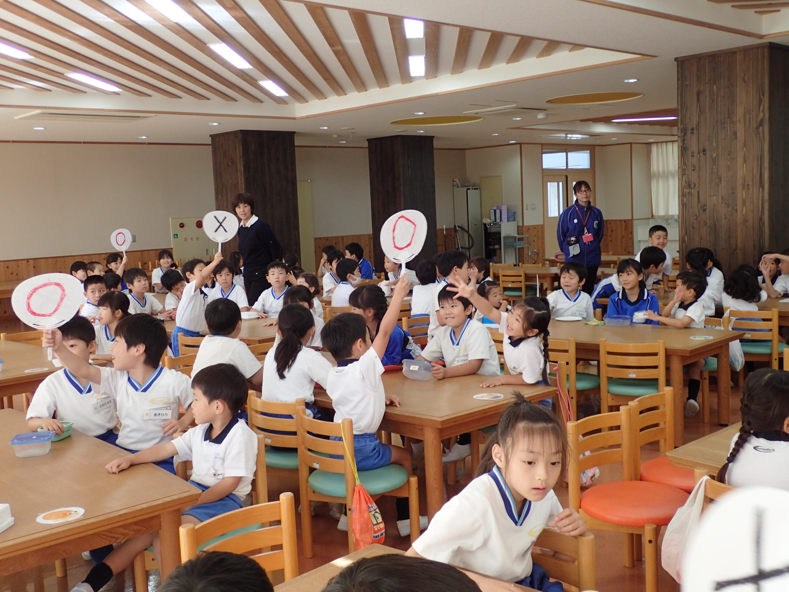 P2生は「さつまいもクイズ」をみんなに出題しました。○×クイズに、PP2生もP2生も一緒になって考えます。サツマイモはジャガイモと同じように育つでしょうか、という問題には、多くの子どもたちが「○」と答えましたが、答えは「×」で、みんなとてもびっくりしていました。