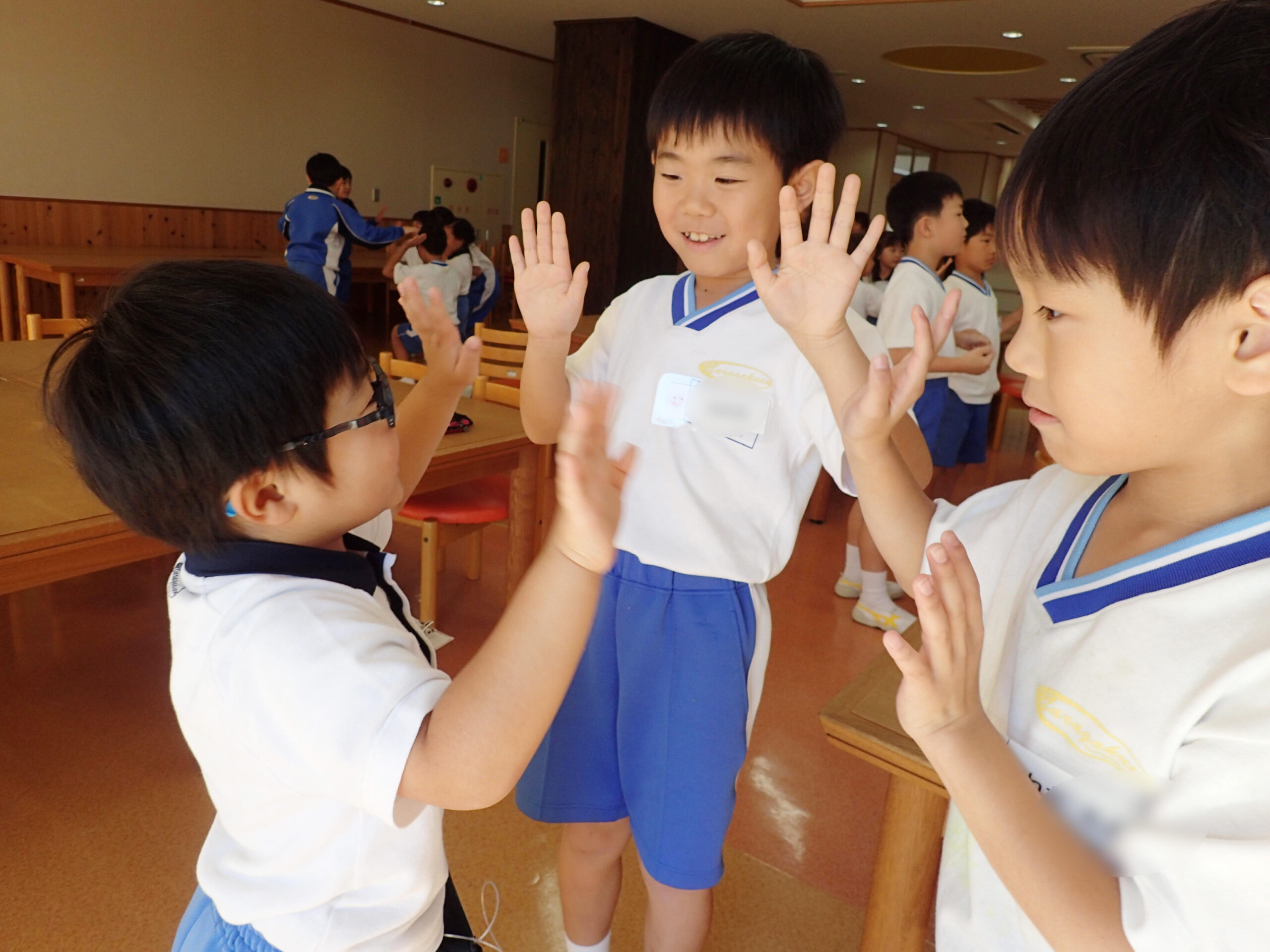 PP2生からは「ふれあい遊び」をしました。PP2生とP2生が円になり、音楽に合わせて、手を合わせたり、ぎゅーっと抱き合って小さくなったりして遊びました。