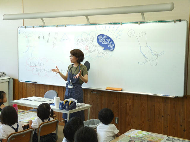 その後、お子さまをお預かりして、「ならとみスタンプラリー」へ出発。図書室では絵本の読み聞かせを、図工室では紙コップを使った工作遊びを、体育館では運動遊びをそれぞれ体験してもらいました。各場所でスタンプを押してもらい、3つたまると「なとみんシール」を貼ってもらえます。みんなとても喜んでいました。