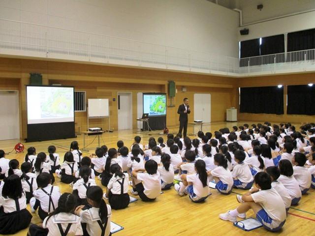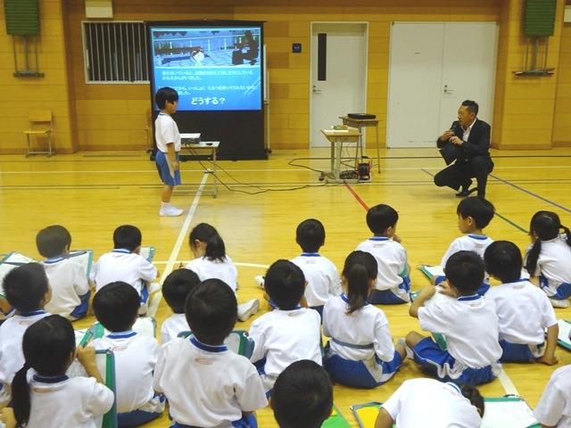 P1(小1).P2(小2)生には「あんしんして登下校」をテーマに話をして頂き、子どもたちは一人にならないようにすることが大切であると知り、安心安全な登下校について考えました。