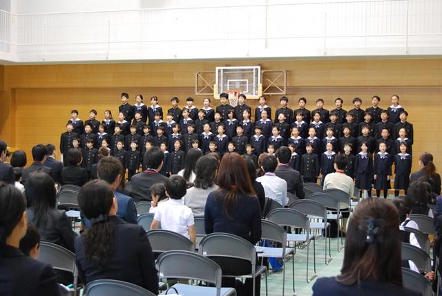 P体育館でのオープニングは、M1生(小学5年生)による合唱でスタート。校歌に続いて「未来への讃歌」を歌い、参加者の皆さんに美しいハーモニーを披露しました。