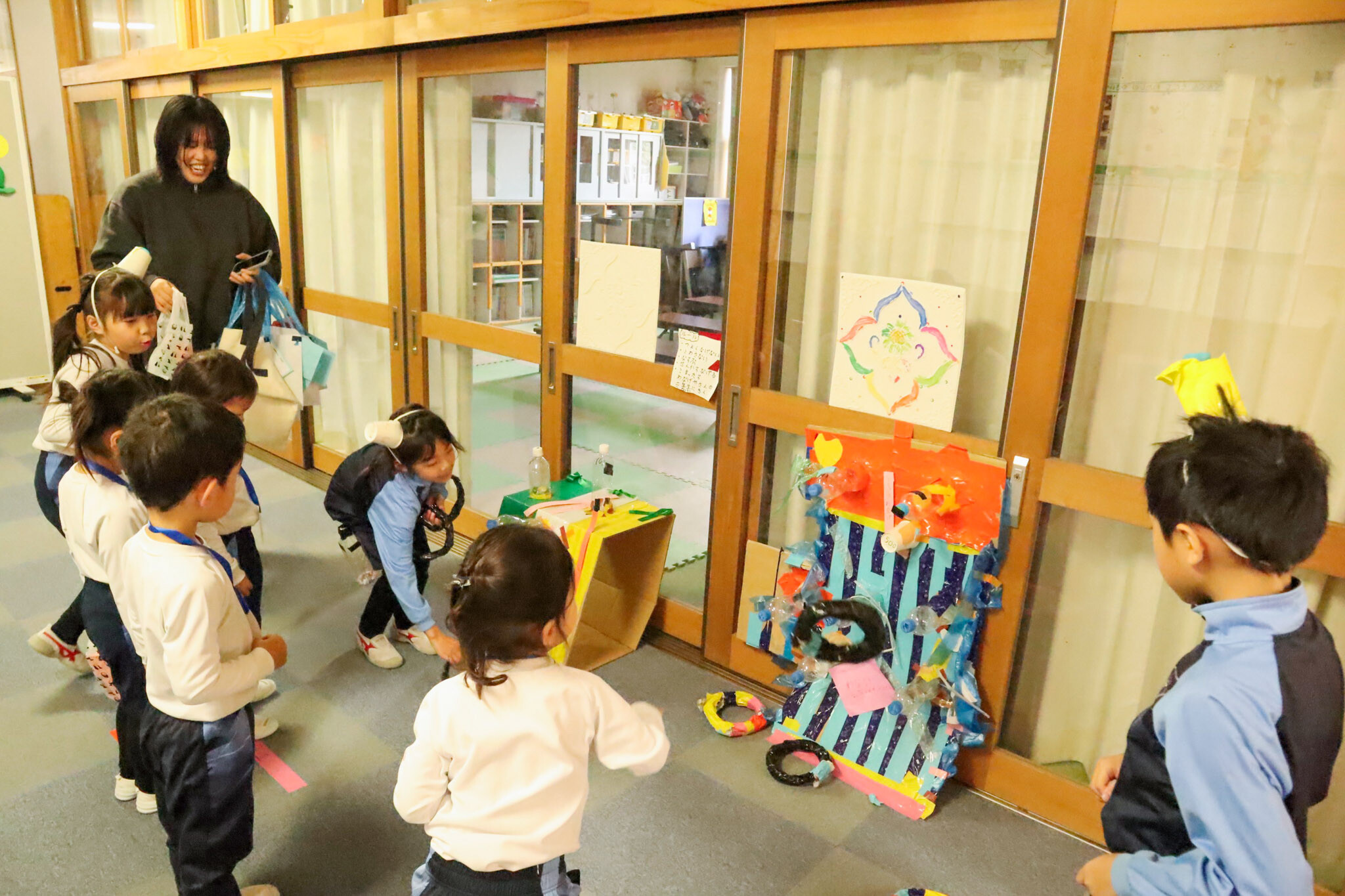次は、会場を「おもちゃランド」へと移しました。ここはP2生が「おもちゃ研究所」の研究員となり、知恵を絞って制作した特設コーナーです。段ボールやペットボトルを巧みに組み合わせたクレーンゲームや魚釣り、さらにはクイズやお化け屋敷など、アイデアと愛情が詰まった力作ばかり。園児たちは体をいっぱい動かして遊び、あちこちから歓声と笑い声が沸き起こりました。