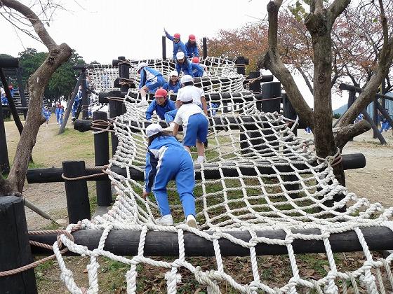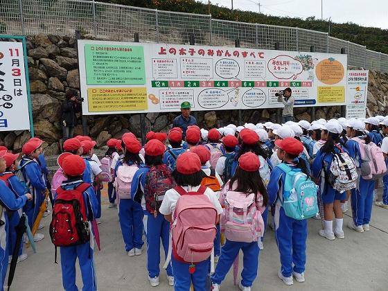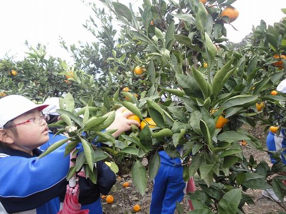 学校からバスに揺られて約1時間、目的地の「上の太子観光みかん園」に到着しました。 バスを降りて長い坂道を登り、みかん園の入口で、園の方から、みかんの取り方や美味しいみかんの見分け方などを教わりました。 その後、一度頂上のテントに荷物を置いて、いよいよみかん狩りです。子どもたちは歓声をあげながら、次々にみかんを取っていました。お土産用に袋に詰め込んだり、そのまま皮をむいて口にして、その甘さにびっくりしたりと大満足の様子でした。 その後、頂上にあるアスレチックを楽しみました。いい具合にお腹もすいたところで、みんなでお弁当をいただきました。 途中、少し雨が降ってきましたが、本格的に降るには至らず、無事に予定の行程をこなして帰ることができました。