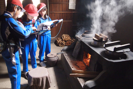 初めに、班ごとで古民家を見学し、発見したことをワークシートに書き込む学習をしました。集合時間を守るためリーダーと時計係を中心に皆で協力し合い、土間や屋根の作りを観察したり、生活用具の足踏みミシンや石臼などの調査をしたりしました。吉野集落の旧前坊家では釜炊きを間近で見ることができ、「昔の炊飯器かな、コンロかな」と興味深い様子でした。