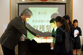 11月7日(月)、小学4年(P4)生が、PMダイニングで『収穫祭』を行いました。 これは、6月から取り組んできた”米づくり”の最後の締めくくりとして、日本古来の『新嘗祭』を体験して、食べ物や自然の実りに対する感謝の気持ちを育もうという目的で行われたものです。各クラスの社会係の児童が代表して、藤原和幸校長に感謝の言葉と共に”新米”を納める儀式を行いました。