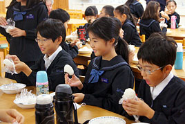 いよいよ、心待ちにしていた『おにぎり作り』です。お櫃から上がる湯気とともに、お米の香りが広がり、児童たちはお米の輝きを感じながらしっかりと握りました。そして、いつにも増して大きな声で感謝の気持ちを込めて「いただきます」を言い、口いっぱいにおにぎりをほおばっていました。「いい香り」「甘い」と感動した様子で、中には3つ目に挑戦する児童もいました。